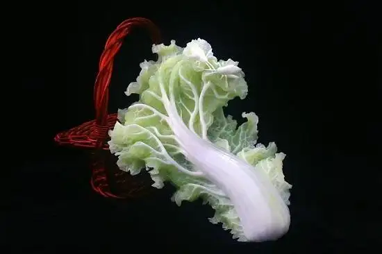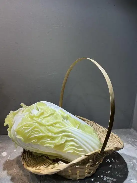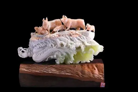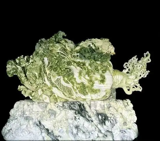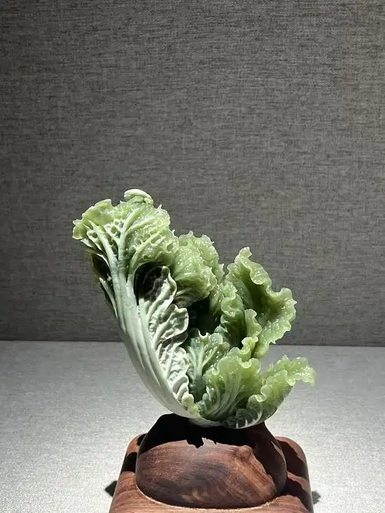 这件玉雕以超写实手法雕琢白菜,玉料的白与嫩黄俏色精准还原白菜的自然色泽,菜叶的褶皱、脉络纹理细腻到几可乱真,搭配竹编提篮的实景陈设,视觉上与真实白菜毫无二致。匠人将玉雕的精工与写实美学极致融合,既展现了登峰造极的雕琢技艺,传递招财纳福的美好寓意,是写实玉雕中的惊艳之作。