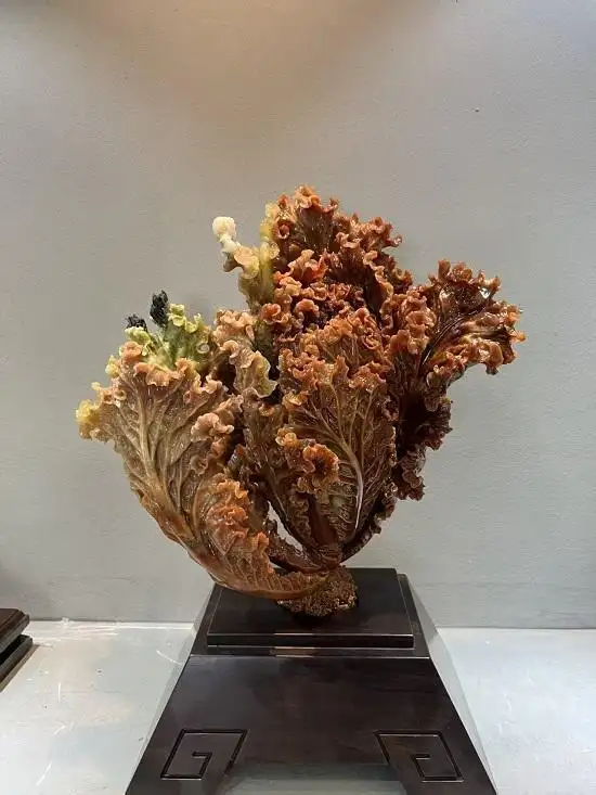这件玉雕取“百财”谐音雕琢白菜,巧用玉料的红棕与黄绿俏色,将菜叶的褶皱、卷曲肌理刻画得纤毫毕现,叶片层叠舒展,宛若鲜活的白菜迎风而立。匠人依料施艺,把玉石的天然质感与白菜的形态神韵相融,搭配古朴的木质底座,既具写实之妙,又藏“百财聚来”的吉祥寓意,是玉雕工艺中俏色巧雕的佳作。
