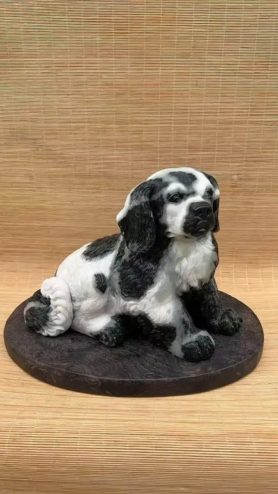 这件玉雕以史宾格犬为原型,巧用玉料黑白俏色精准还原犬只的毛色分布,毛发的蓬松肌理、神态的灵动鲜活刻画得惟妙惟肖,坐姿沉稳又不失俏皮。匠人以超写实工艺雕琢出犬的形体与神韵,搭配素净的木质底座,既展现了玉雕俏色巧雕的精湛技艺,又借“犬”的谐音传递“旺财守家”的吉祥寓意,是写实玉雕中的传神之作。
