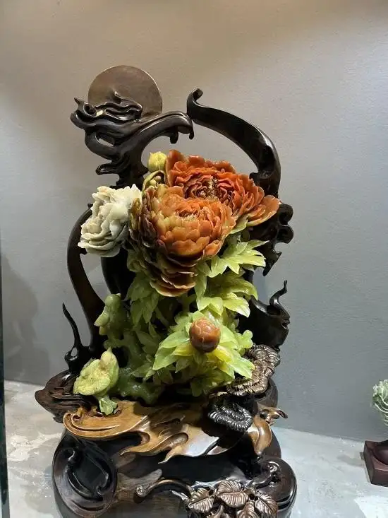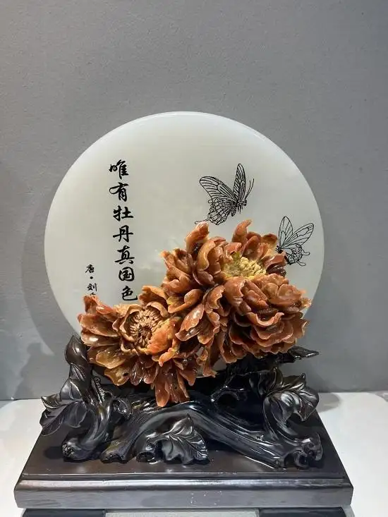 这款玉雕以牡丹为核心意象,巧用玉料色泽雕琢出层叠绽放的牡丹花瓣,肌理鲜活如真;后方白玉圆屏镌“唯有牡丹真国色”诗句与蝶纹,墨韵与玉质相融,搭配乌木雕刻的枝蔓底座,将玉雕工艺与古典诗词意境结合,尽显牡丹雍容华贵的国色之美,是匠心与东方美学的精妙融合。
