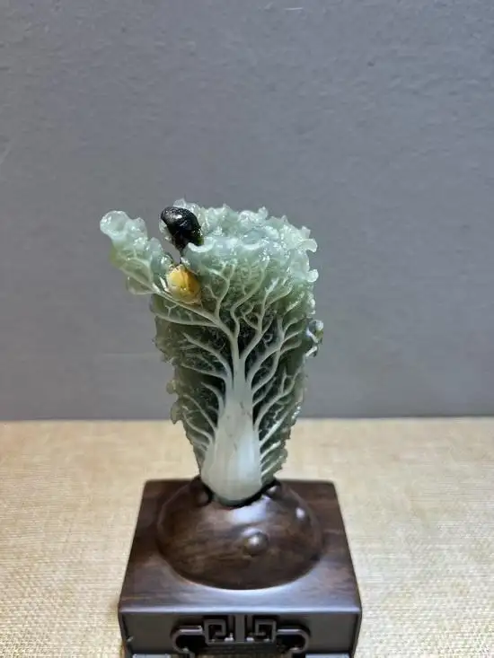 这件青玉白菜玉雕,以整块青玉随形雕琢,巧用玉料的深浅翠色区分菜叶与菜帮,叶片的脉络、褶皱雕琢得细腻逼真,卷曲舒展的形态宛若鲜活白菜。匠人以写实手法还原白菜的自然神韵,搭配温润的木质底座,既显玉雕工艺的精湛,又借“百财”谐音传递招财纳福的吉祥寓意,是兼具审美与美好期许的玉雕精品。