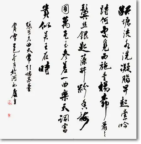 崔庆丰先生的书法作品,兼具传统法度与当代意趣,在笔墨流转间,尽显冬去春来的诗意与对美好未来的期许。其行书作品《张可久·太常引·姑苏台赏雪》,以圆劲灵动的笔势,将元曲中“断塘流水洗凝脂,早起索吟诗”的冬雪清景,化作纸上的视觉盛宴。开篇“断塘流水洗凝脂”七字,起笔以侧锋入纸,线条温润而不失筋骨,“断”字的牵丝映带与“凝”字的厚重收笔形成鲜明对比,似雪水消融的柔婉与冰肌玉骨的清寒交织。“何处觅西施”一句,笔势渐趋舒缓,“觅”字的长捺舒展飘逸,暗含寻幽访古的悠然意趣;“萧萧鬓丝银匙”则以细笔勾勒发丝的纤柔,“银匙”二字以重墨点染,如霜雪覆于匙柄,冷暖交织间,将冬日的清寂与诗意铺展得淋漓尽致。