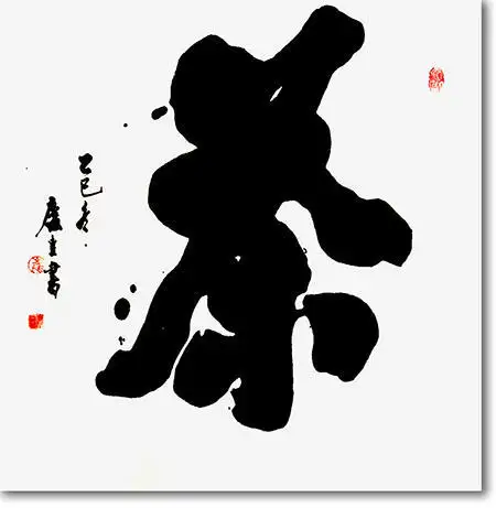 另一幅榜书“茶”字,更是以极简的笔墨承载着极丰的意蕴。整字以泼墨法写就,墨色浓淡交融,形态憨拙而大气。上部的草字头如积雪覆盖的茶芽,下部的“木”字似虬曲的老枝,墨块的晕染与飞白的留白,恰如冬雪消融后茶芽初绽的鲜活。“茶”字的憨态与行书的灵动形成互补,前者以静态的厚重传递冬日的沉淀,后者以动态的流转书写春日的生机,两幅作品一静一动、一文一朴,共同诠释了冬去春来的生命哲思。