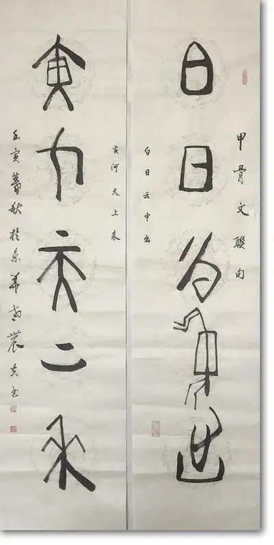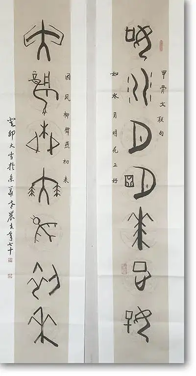 对甲骨文的痴迷与推广,是赵士群先生艺术生涯的重要篇章。他深知甲骨文作为汉字源头的文化价值,更感慨于这一古老文字在民间的神秘与小众。于是,他以“老农夫”的质朴与执着,一头扎进甲骨文的研究与书写中,从字形考证到笔法探索,从章法布局到内涵阐释,每一笔都凝聚着对文化根脉的敬畏。他写下的对联、条幅,不仅是艺术作品,更是普及甲骨文知识的生动教材,让更多人认识到这一“中国记忆”的永恒价值,也让这份民族文化自信在当代社会中生根发芽。