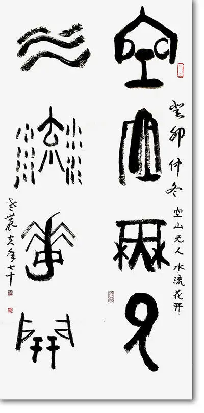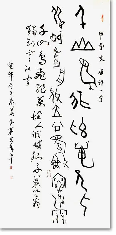 在书写技法上,赵士群先生将多年的书法修养与甲骨文学养融会贯通。他以中锋行笔保证线条的骨力,以侧锋取势增添字形的灵动,使每个甲骨文既保持了古文字的象形特征,又具备了书法艺术的审美张力。章法上,作品疏密有致、虚实相生,字与字之间气脉连贯,行与行之间顾盼生情,整体呈现出和谐统一的视觉效果。这种对传统的尊重与创新,体现了赵士群先生“以古为新”的艺术追求,也让他的甲骨文书法既有学术的严谨性,又有艺术的感染力。