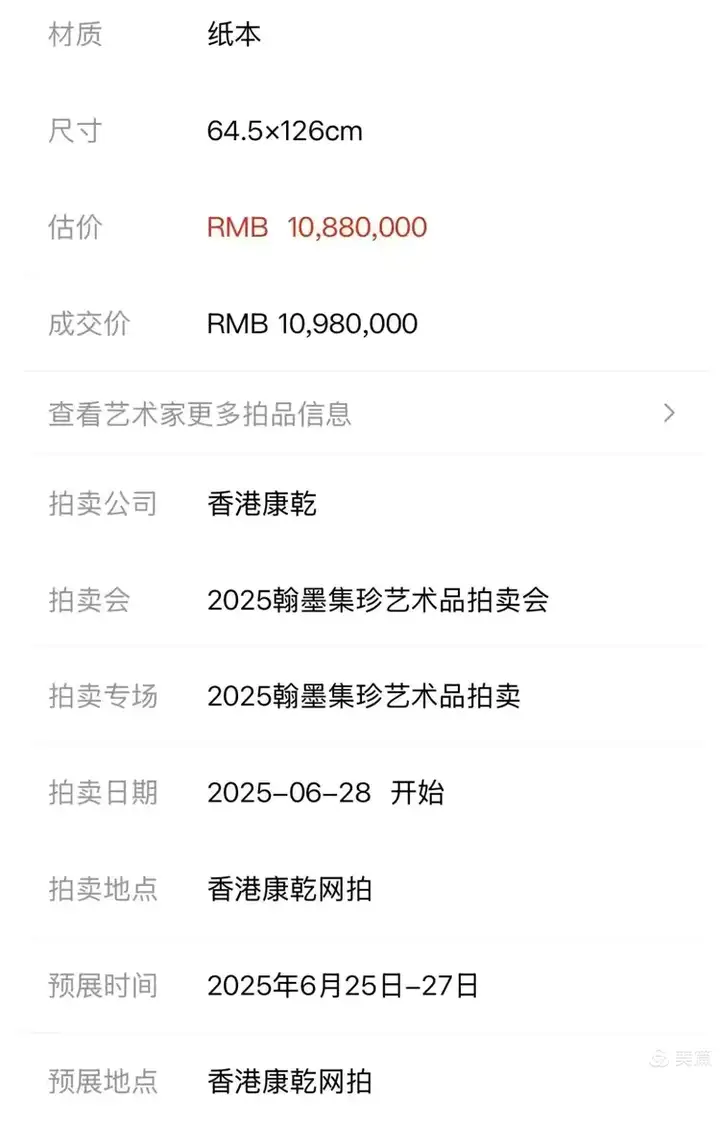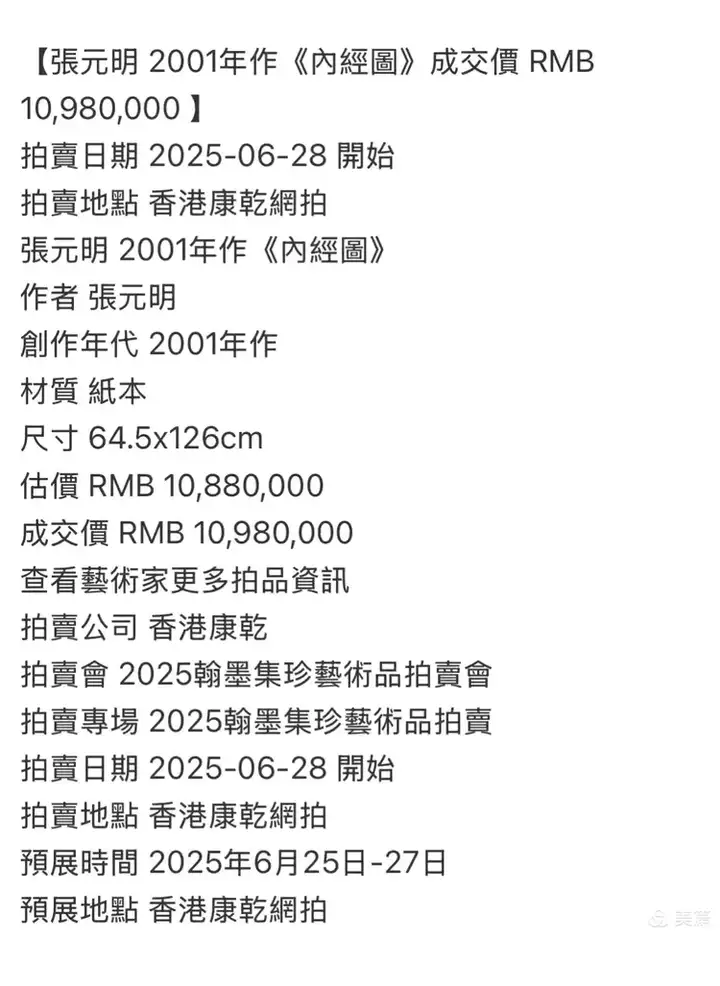 2025年6月28 日,香港拍賣公司香港康乾拍賣張元明 2001年作《內經圖》,成交價RMB 10,980,000