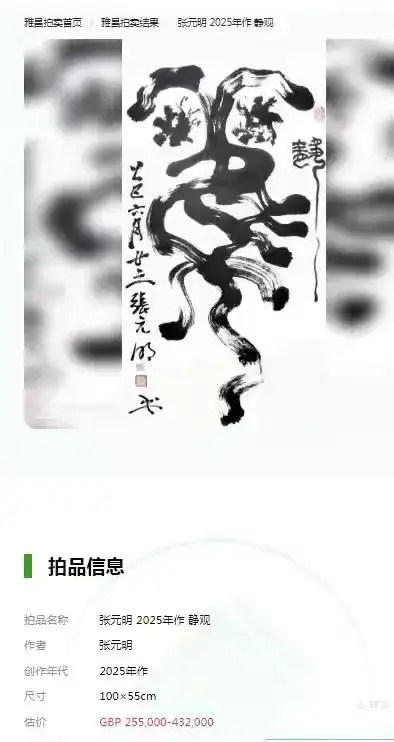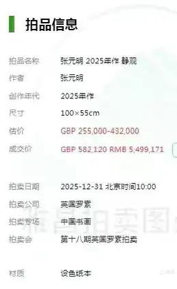 2025年12月31日,英国罗素拍卖公司拍张元明2025年作《静观》,成交价GBP 582.120 一RMB 5499171