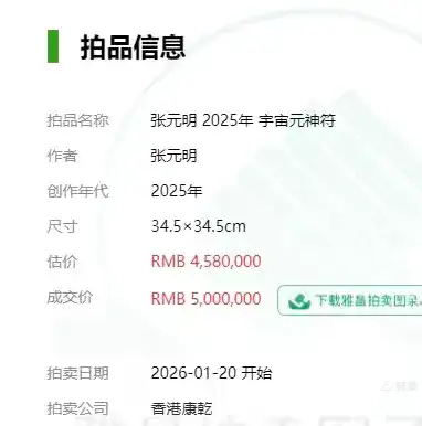 2025年1月20日,香港康乾拍卖有限公司拍张元明作《宇宙元神符》成交价RMB 5000000